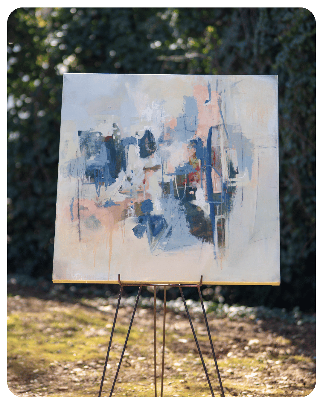 An 40″ x 40″ abstract exploration of motion, ideas, and transformation, Innovation layers soft neutrals with cool blues and warm blush tones to create a sense of depth and evolution. Gestural brushwork and delicate linear elements intersect like emerging thoughts, suggesting progress and creative energy. The composition feels both structured and fluid, embodying the tension between imagination and design. Modern yet atmospheric, this piece brings a refined, contemporary presence to any space.
