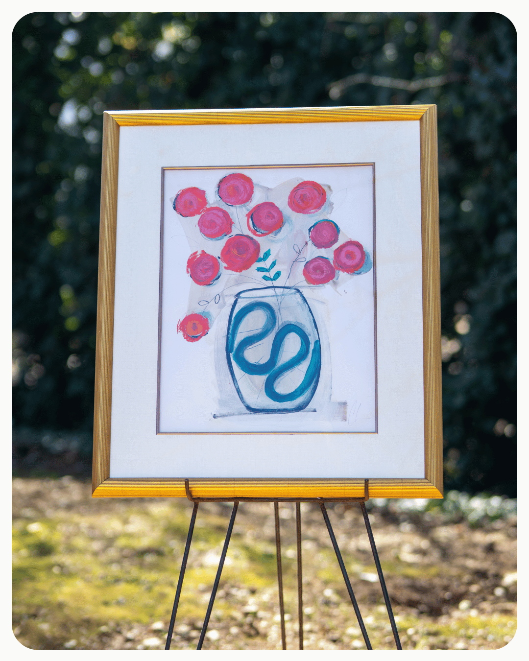 Up for bid is “Funky Floral,” an eye-catching piece by Colleen Leach. Measuring 28 x 33.5 inches, this vibrant artwork features a playful arrangement of whimsical flowers in a uniquely designed vase, brought to life with acrylic and oil sticks. It is beautifully framed by the Purple House Gallery, making it a striking addition to any art collection.